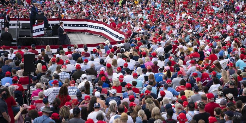 A 13 días de dar positivo a coronavirus, el presidente de EU (círculo) realiza un acto multitudinario en Carolina del Norte; asistentes, sin sana distancia ni mascarillas
